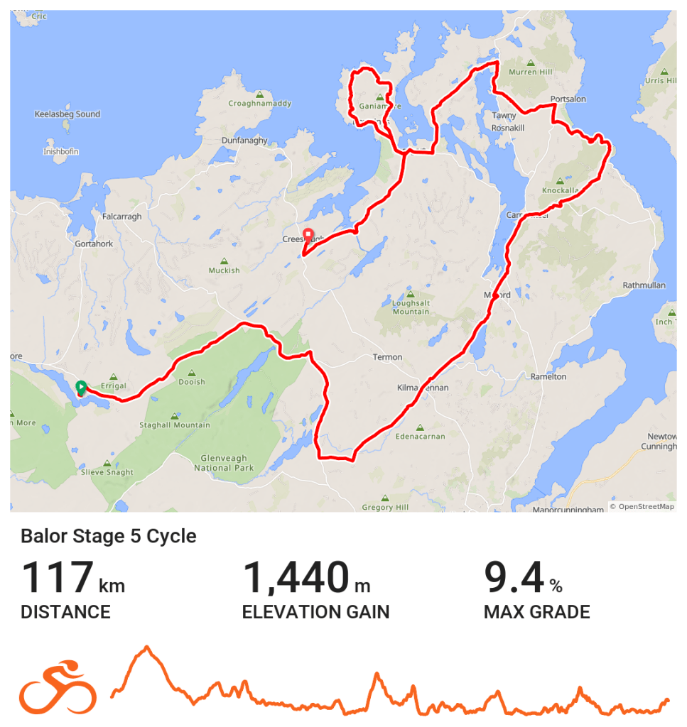 Stage 5 is the queen stage of the Balor Multisport Race, a grueling 117 km cycle with 1440m of elevation gain, from TA2 in Dunlewey to TA3 at Wild Atlantic Camp in Creeslough. This non-drafting stage requires competitors to ride solo, tackling exposed and demanding roads that wind along the rugged coastline.